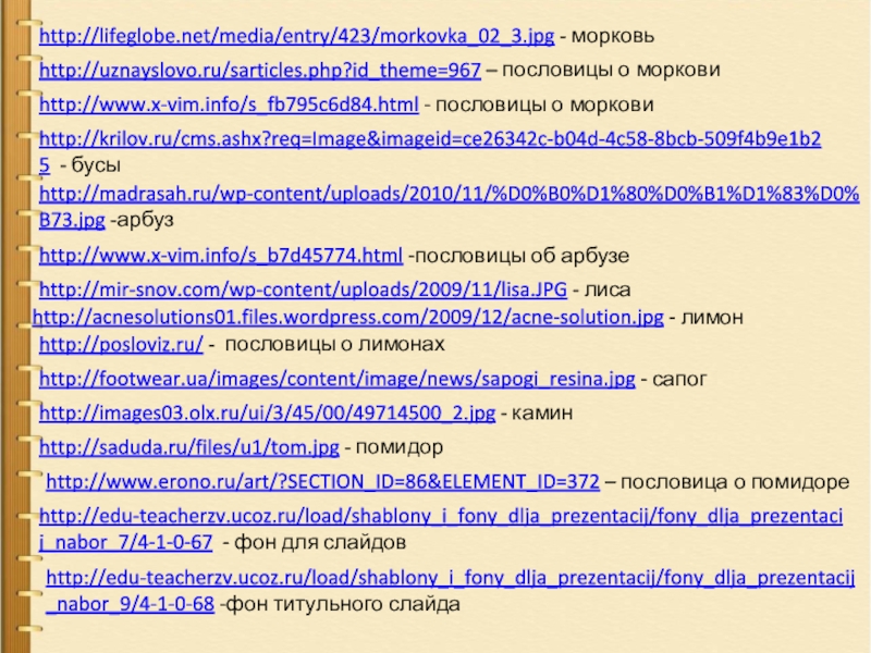 http://edu-teacherzv.ucoz.ru/load/shablony_i_fony_dlja_prezentacij/fony_dlja_prezentacij_nabor_7/4-1-0-67 - фон для слайдов