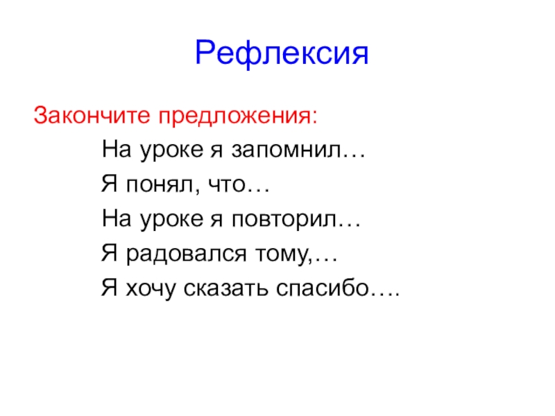 Рефлексия Закончите предложения:     На уроке я запомнил…     Я