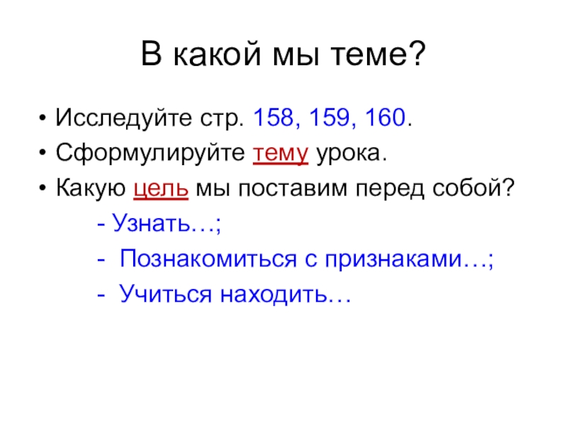 В какой мы теме?Исследуйте стр. 158, 159, 160.Сформулируйте тему урока.Какую цель мы поставим перед собой?