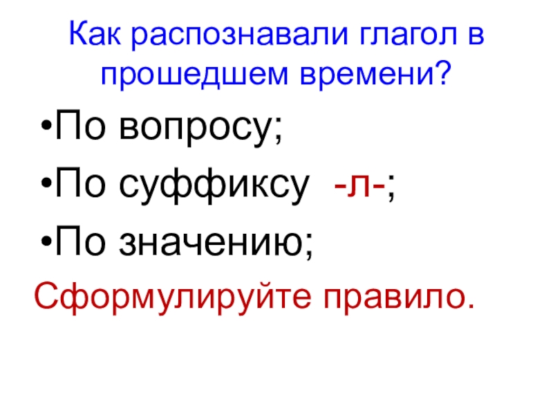 Как распознавали глагол в прошедшем времени?По вопросу;По суффиксу -л-;По значению;Сформулируйте правило.