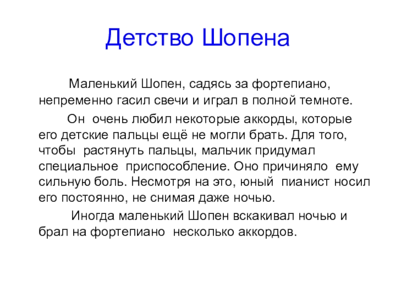 Детство Шопена	    Маленький Шопен, садясь за фортепиано, непременно гасил свечи и играл в полной