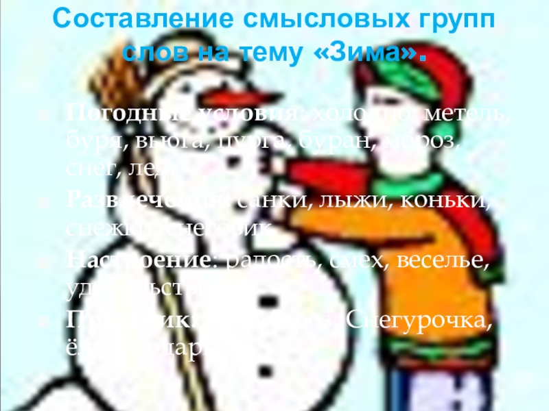 Слайд 7Составление смысловых групп слов на тему «Зима».