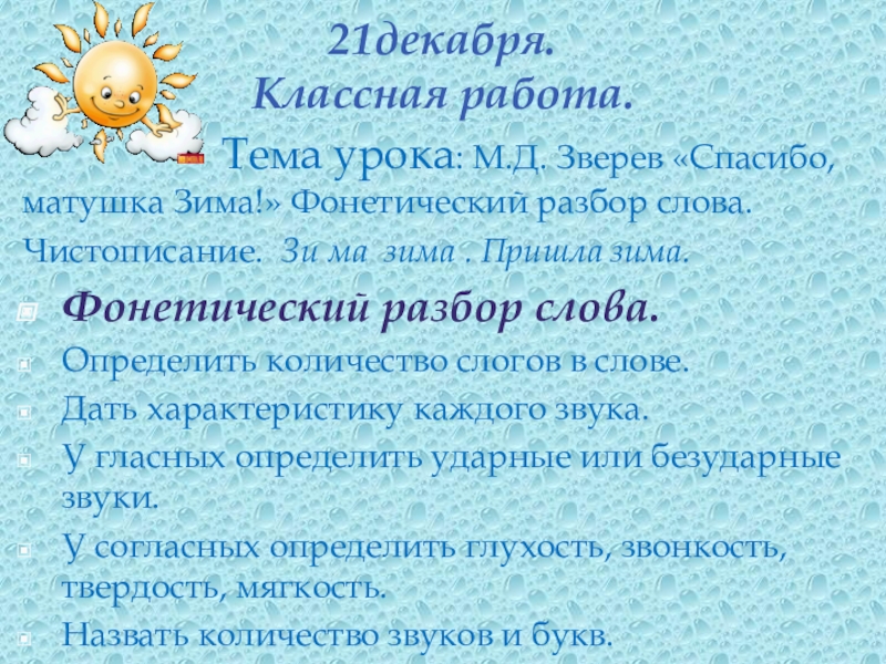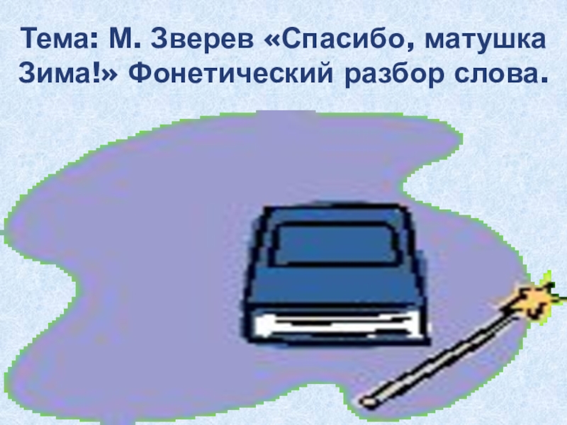 Слайд 1Тема: М. Зверев «Спасибо, матушка Зима!» Фонетический разбор слова.