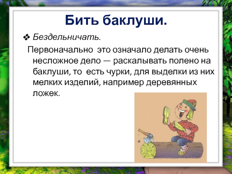 Слайд 4Бить баклуши.