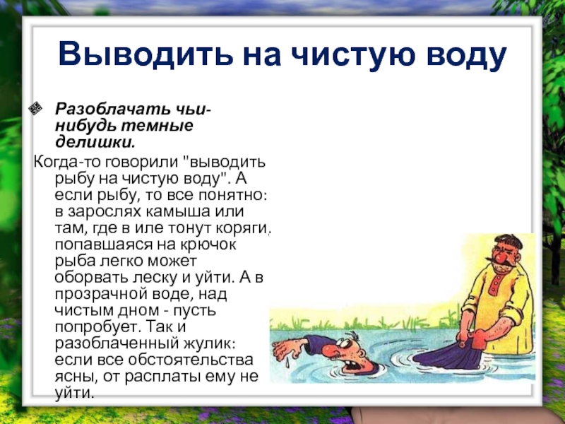 чистую воду". А если рыбу, то все понятно: в зарослях камыша или там, где в иле тонут коряги, попавшаяся на крючок рыба легко может оборвать леску и уйти. А в прозрачной воде, над чистым дном - пусть попробует. Так и разоблаченный жулик: если все обстоятельства ясны, от расплаты ему не уйти.