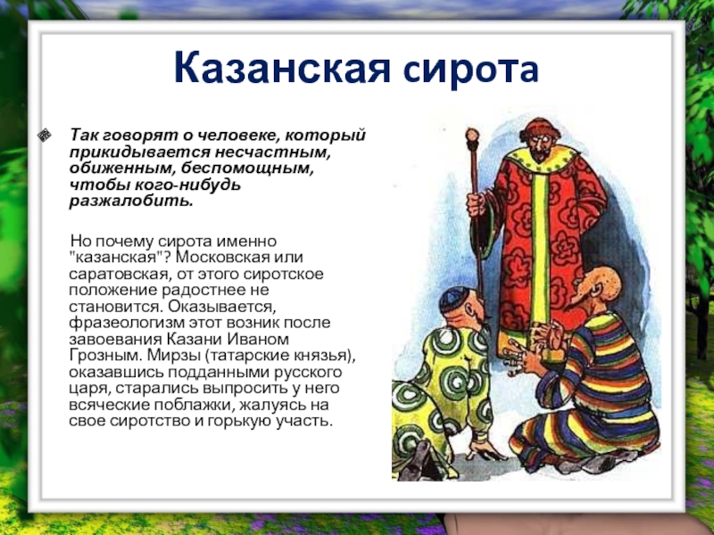 Но почему сирота именно "казанская"? Московская или саратовская, от этого сиротское положение радостнее не становится. Оказывается, фразеологизм этот возник после завоевания Казани Иваном Грозным. Мирзы (татарские князья), оказавшись подданными русского царя, старались выпросить у него всяческие поблажки, жалуясь на свое сиротство и горькую участь.