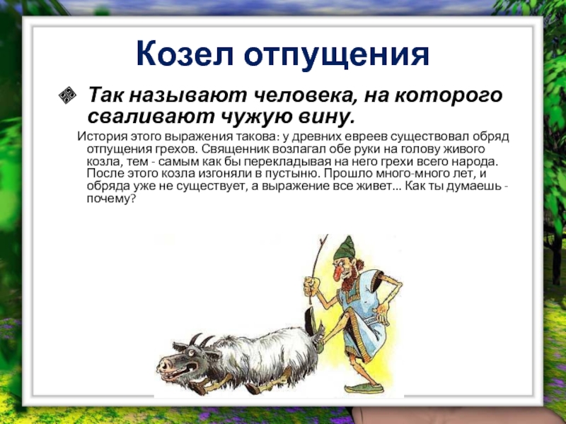 этого выражения такова: у древних евреев существовал обряд отпущения грехов. Священник возлагал обе руки на голову живого козла, тем - самым как бы перекладывая на него грехи всего народа. После этого козла изгоняли в пустыню. Прошло много-много лет, и обряда уже не существует, а выражение все живет... Как ты думаешь - почему?