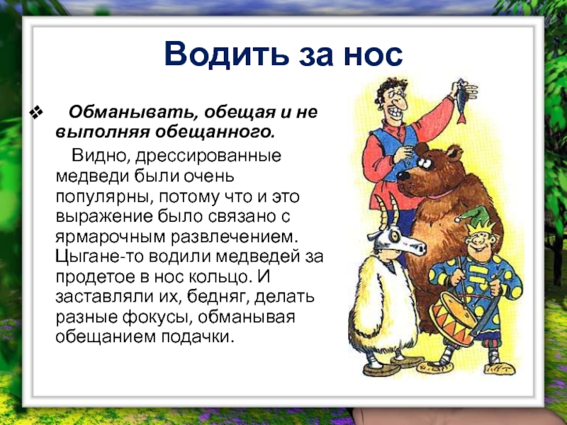 Видно, дрессированные медведи были очень популярны, потому что и это выражение было связано с ярмарочным развлечением. Цыгане-то водили медведей за продетое в нос кольцо. И заставляли их, бедняг, делать разные фокусы, обманывая обещанием подачки.