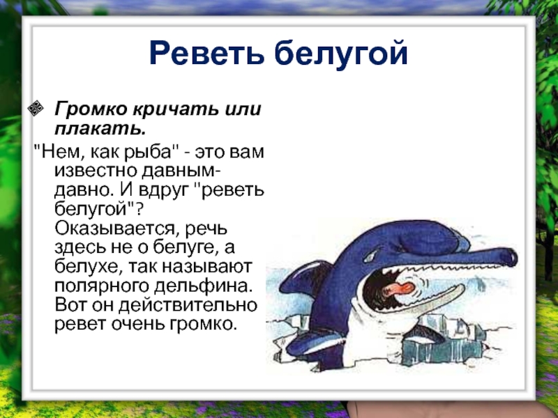 давным-давно. И вдруг "реветь белугой"? Оказывается, речь здесь не о белуге, а белухе, так называют полярного дельфина. Вот он действительно ревет очень громко.