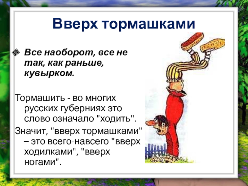 Значит, "вверх тормашками" – это всего-навсего "вверх ходилками", "вверх ногами".
