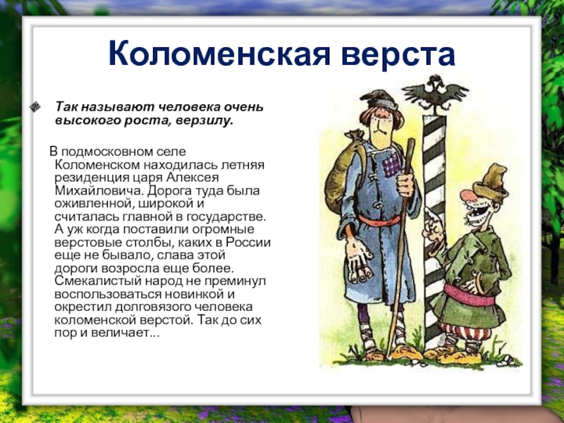 подмосковном селе Коломенском находилась летняя резиденция царя Алексея Михайловича. Дорога туда была оживленной, широкой и считалась главной в государстве. А уж когда поставили огромные верстовые столбы, каких в России еще не бывало, слава этой дороги возросла еще более. Смекалистый народ не преминул воспользоваться новинкой и окрестил долговязого человека коломенской верстой. Так до сих пор и величает...