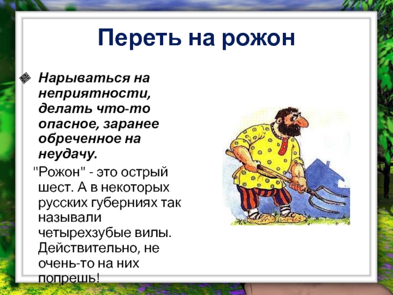 "Рожон" - это острый шест. А в некоторых русских губерниях так называли четырехзубые вилы. Действительно, не очень-то на них попрешь!