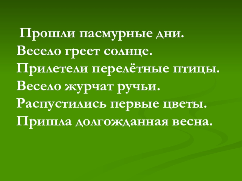 Прошли пасмурные дни. Весело греет солнце. Прилетели перелётные птицы. Весело журчат ручьи. Распустились первые цветы. Пришла долгожданная