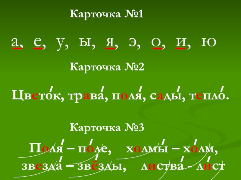 Поля – поле,  холмы – холм, звезда – звёзды,  листва - листКарточка №1Карточка №2Цветок, трава,