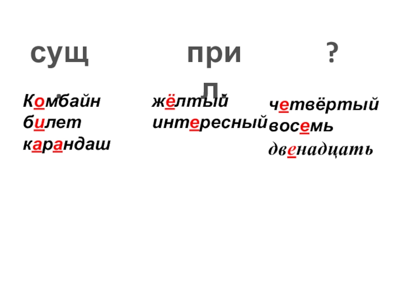 сущ.прил.?Комбайнбилеткарандашжёлтыйинтересныйчетвёртыйвосемьдвенадцать