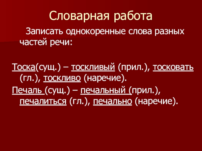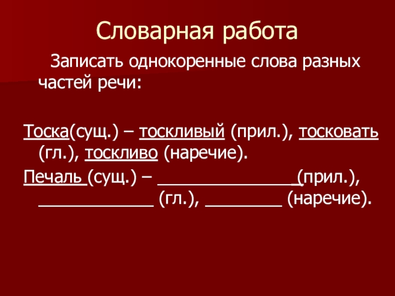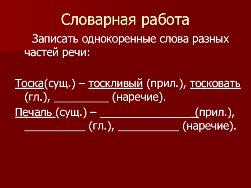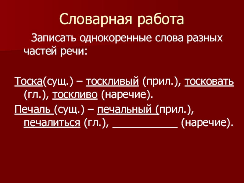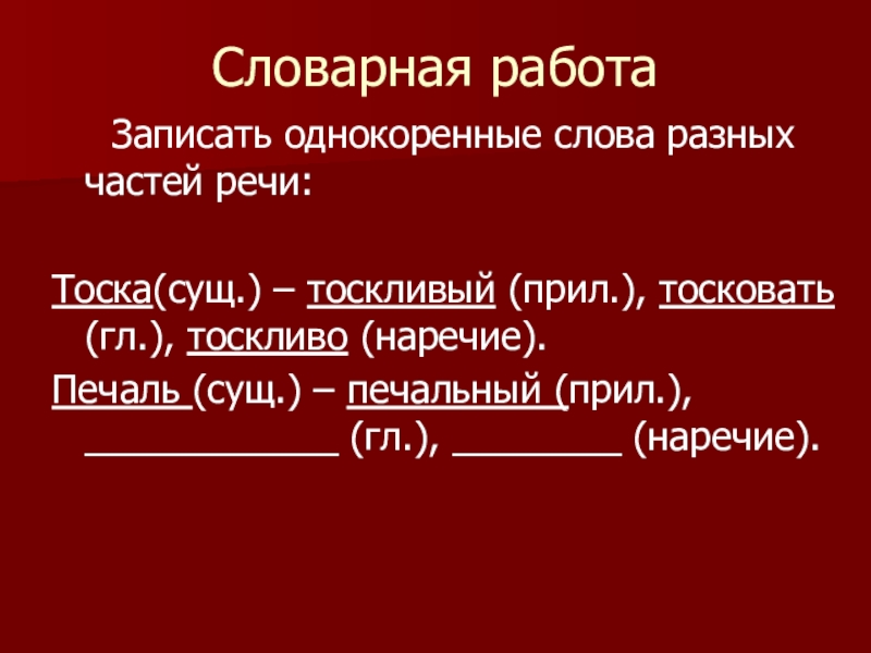 Тоска(сущ.) – тоскливый (прил.), тосковать (гл.), тоскливо (наречие).
