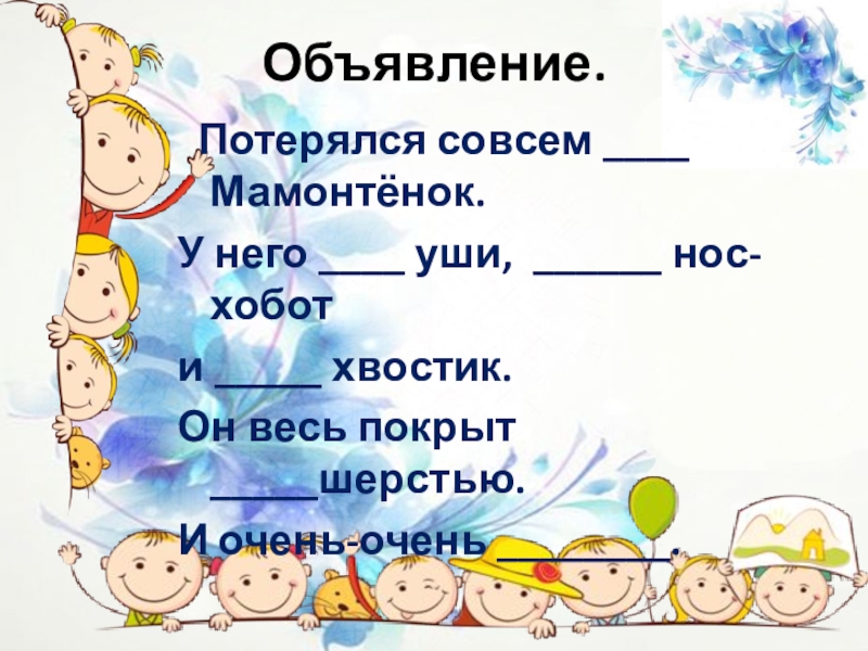 Объявление.  Потерялся совсем ____ Мамонтёнок.У него ____ уши, ______ нос-хобот и _____ хвостик. Он весь покрыт