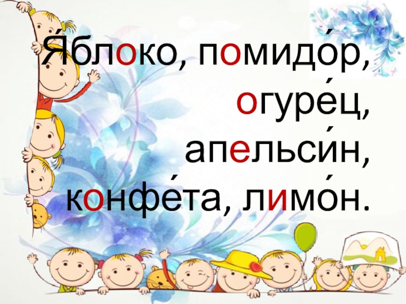 Слайд 9Я́блоко, помидо́р, огуре́ц, апельси́н, конфе́та, лимо́н.