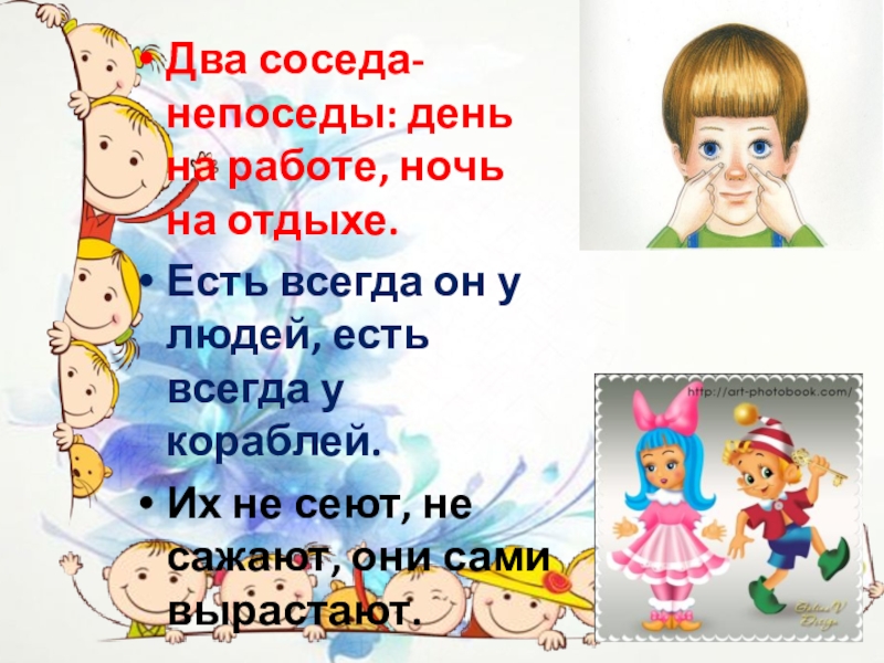 Два соседа-непоседы: день на работе, ночь на отдыхе. Есть всегда он у людей, есть всегда у кораблей.