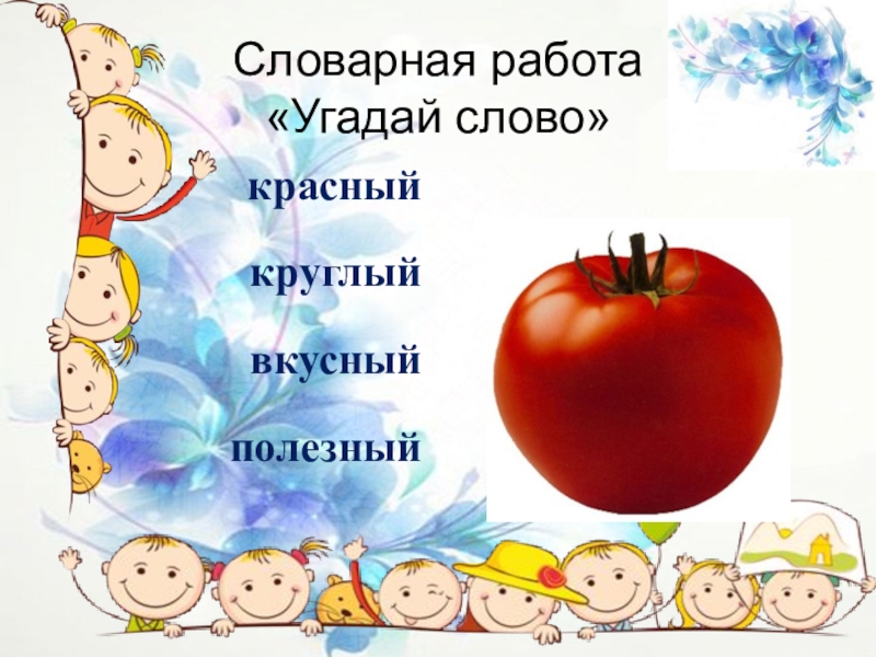Словарная работа «Угадай слово»красныйкруглыйвкусный        полезный