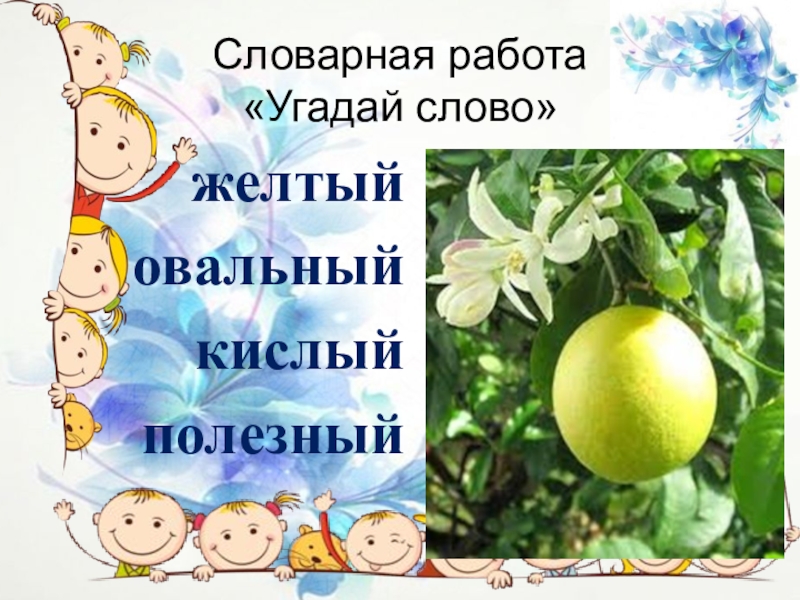Словарная работа «Угадай слово»желтыйовальныйкислыйполезный