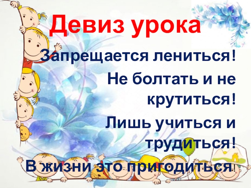 Девиз урокаЗапрещается лениться!Не болтать и не крутиться!Лишь учиться и трудиться!В жизни это пригодиться!