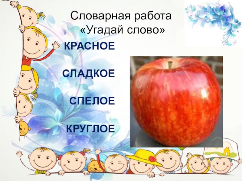Словарная работа  «Угадай слово»КРАСНОЕСЛАДКОЕСПЕЛОЕКРУГЛОЕ