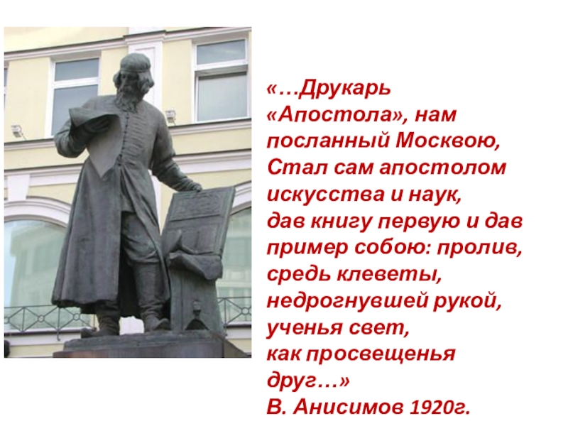 «…Друкарь «Апостола», нам посланный Москвою, Стал сам апостолом искусства и наук,  дав книгу первую и дав