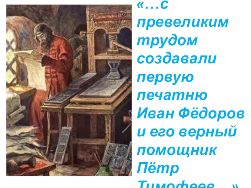 Слайд 4«…с превеликим трудом создавали первую печатню Иван Фёдоров и его верный