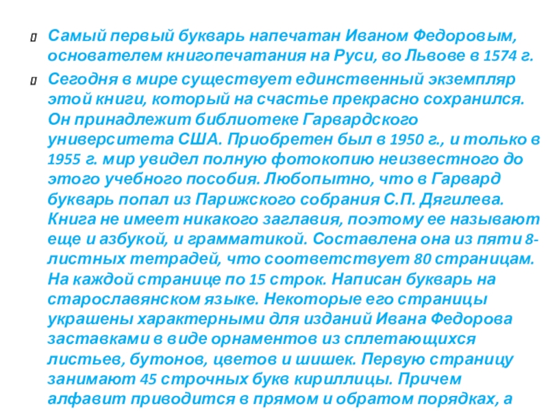 Сегодня в мире существует единственный экземпляр этой книги, который на счастье прекрасно сохранился. Он принадлежит библиотеке Гарвардского университета США. Приобретен был в 1950 г., и только в 1955 г. мир увидел полную фотокопию неизвестного до этого учебного пособия. Любопытно, что в Гарвард букварь попал из Парижского собрания С.П. Дягилева. Книга не имеет никакого заглавия, поэтому ее называют еще и азбукой, и грамматикой. Составлена она из пяти 8-листных тетрадей, что соответствует 80 страницам. На каждой странице по 15 строк. Написан букварь на старославянском языке. Некоторые его страницы украшены характерными для изданий Ивана Федорова заставками в виде орнаментов из сплетающихся листьев, бутонов, цветов и шишек. Первую страницу занимают 45 строчных букв кириллицы. Причем алфавит приводится в прямом и обратом порядках, а также в разбивку 8-ю колонками. Вероятно, такой прием повторения алфавита помогал лучшему запоминанию.