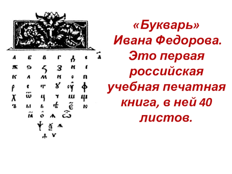 «Букварь»  Ивана Федорова.  Это первая российская учебная печатная книга, в ней 40 листов.