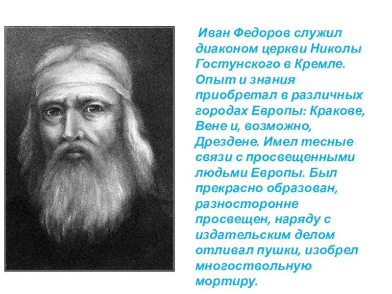 Иван Федоров служил диаконом церкви Николы Гостунского в Кремле. Опыт и знания приобретал в различных городах Европы: Кракове, Вене и, возможно, Дрездене. Имел тесные связи с просвещенными людьми Европы. Был прекрасно образован, разносторонне