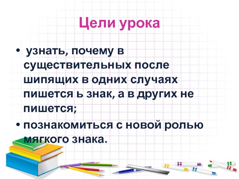 Цели урока узнать, почему в существительных после шипящих в одних случаях пишется ь знак, а в других