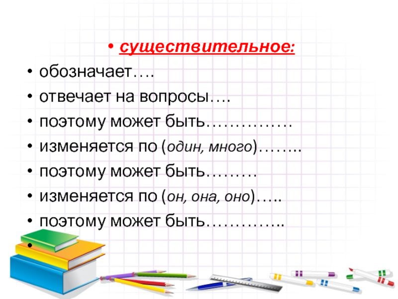 существительное:обозначает….отвечает на вопросы….поэтому может быть……………изменяется по (один, много)……..поэтому может быть………изменяется по (он, она, оно)…..поэтому может быть…………..