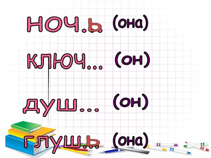 ноч... ь ключ... душ... глуш... ь (она) (она) (он) (он)