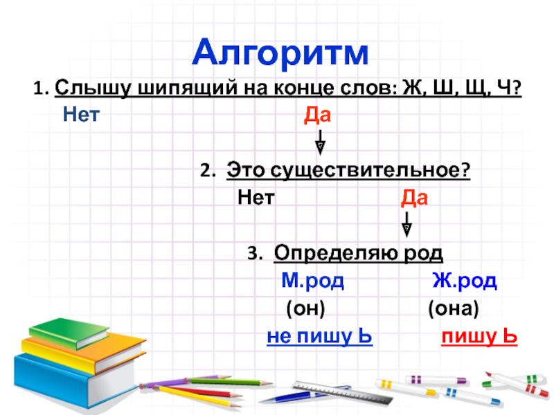 Алгоритм1. Слышу шипящий на конце слов: Ж, Ш, Щ, Ч?   Нет