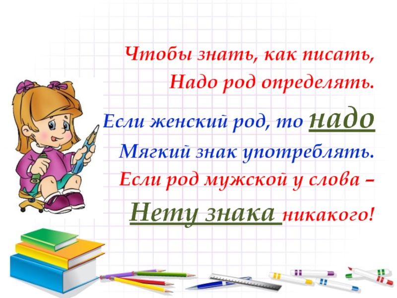 Чтобы знать, как писать, Надо род определять. Если женский род, то надо Мягкий знак употреблять. Если род