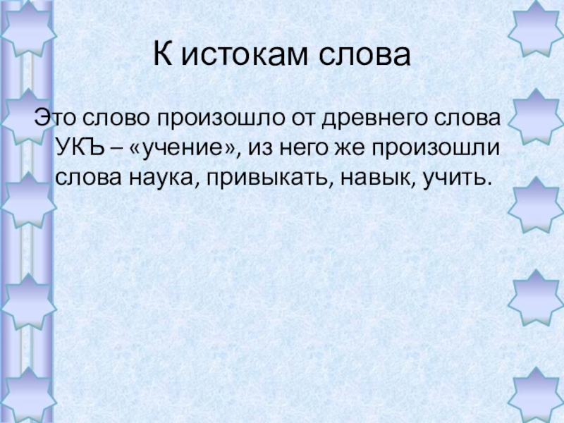 К истокам словаЭто слово произошло от древнего слова УКЪ – «учение», из него же произошли слова наука,