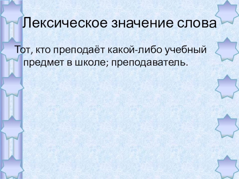 Тот, кто преподаёт какой-либо учебный предмет в школе; преподаватель.Лексическое значение слова