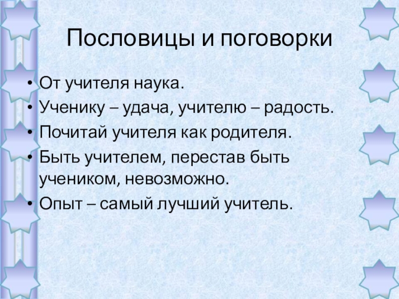 Пословицы и поговоркиОт учителя наука.Ученику – удача, учителю – радость.Почитай учителя как родителя.Быть учителем, перестав быть учеником,