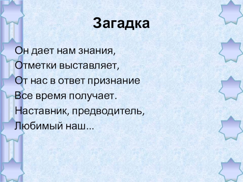 Он дает нам знания,Отметки выставляет,От нас в ответ признаниеВсе время получает.Наставник, предводитель,Любимый наш... Загадка