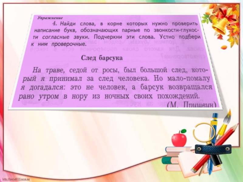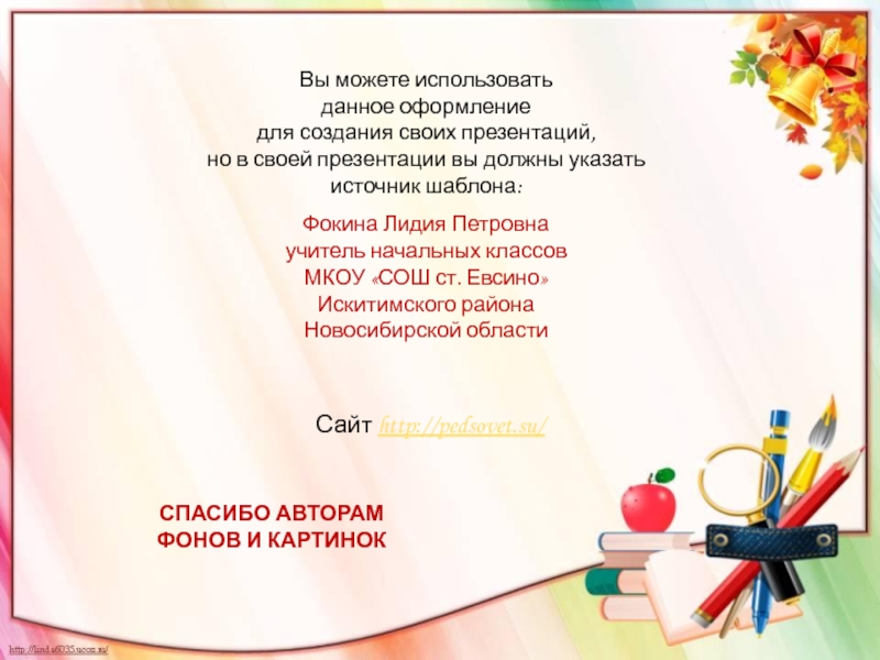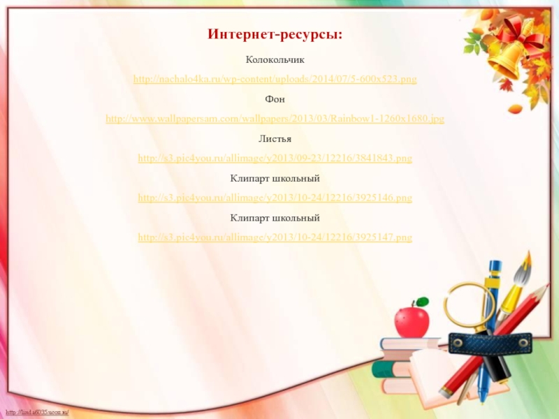 Интернет-ресурсы:Колокольчик http://nachalo4ka.ru/wp-content/uploads/2014/07/5-600x523.png Фон http://www.wallpapersam.com/wallpapers/2013/03/Rainbow1-1260x1680.jpg Листья http://s3.pic4you.ru/allimage/y2013/09-23/12216/3841843.png Клипарт школьный http://s3.pic4you.ru/allimage/y2013/10-24/12216/3925146.png Клипарт школьный http://s3.pic4you.ru/allimage/y2013/10-24/12216/3925147.png