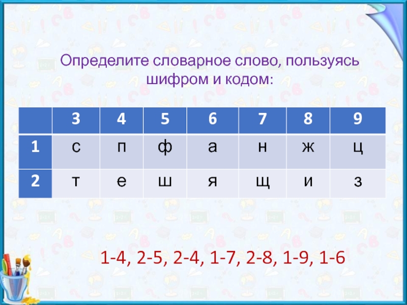 Слайд 4Определите словарное слово, пользуясь шифром и кодом: