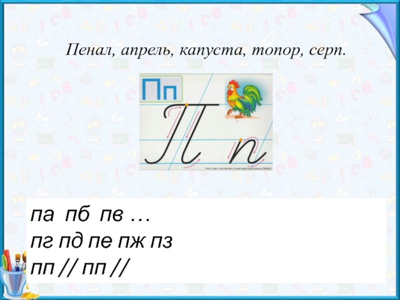 па  пб пв … пг пд пе пж пзпп // пп //Пенал, апрель, капуста, топор, серп.
