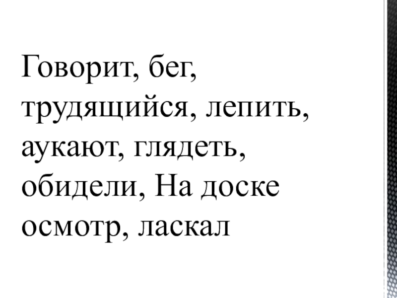 Слайд 4Говорит, бег, трудящийся, лепить, аукают, глядеть, обидели, На доске осмотр, ласкал