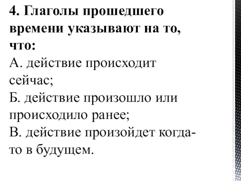 4. Глаголы прошедшего времени указывают на то, что: А. действие происходит сейчас;  Б. действие произошло или