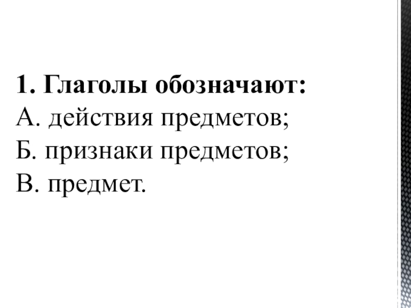 1. Глаголы обозначают: А. действия предметов;  Б. признаки предметов;  В. предмет.