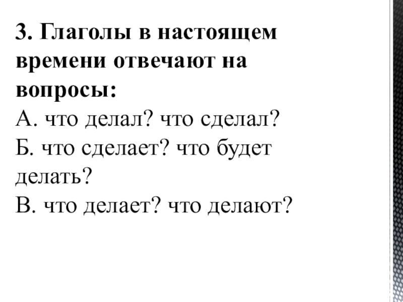 3. Глаголы в настоящем времени отвечают на вопросы: А. что делал? что сделал?  Б. что сделает?