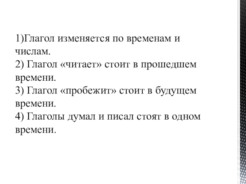 1)Глагол изменяется по временам и числам. 2) Глагол «читает» стоит в прошедшем времени. 3) Глагол «пробежит» стоит