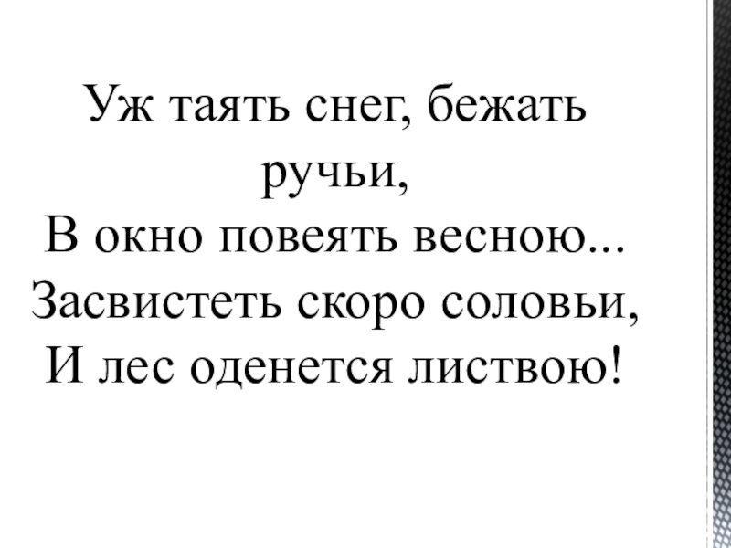 Слайд 7Уж таять снег, бежать ручьи, В окно повеять весною... Засвистеть скоро соловьи, И лес